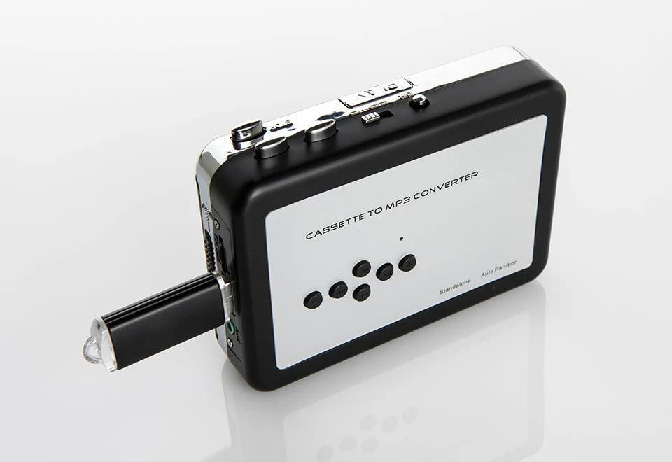 The Cassette to MP3 Converter turns old cassettes into high-quality (128K) digital MP3 files, without a computer. It’s easy to use — simply insert your cassette tape, plug in the included 8GB USB flash drive and press a button. No computer or additional software is needed. Features auto and manual recording modes, plus an auxiliary line in jack for converting other audio sources (radio, LP, CD, etc.).