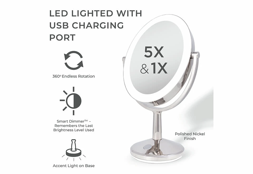 The Cordless LED Oval Mirror is the multifunction vanity mirror with 5X and 1X magnification, plus dimmable lighting for a full view of your face and hair.
