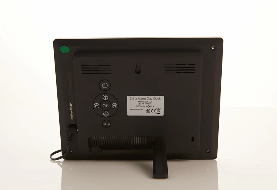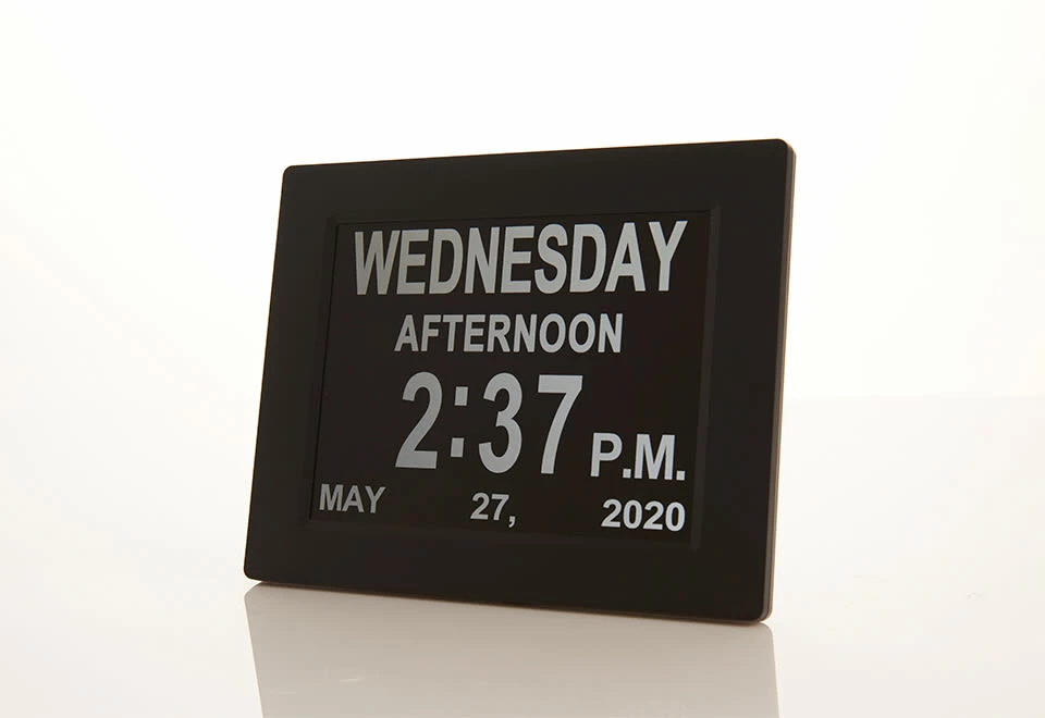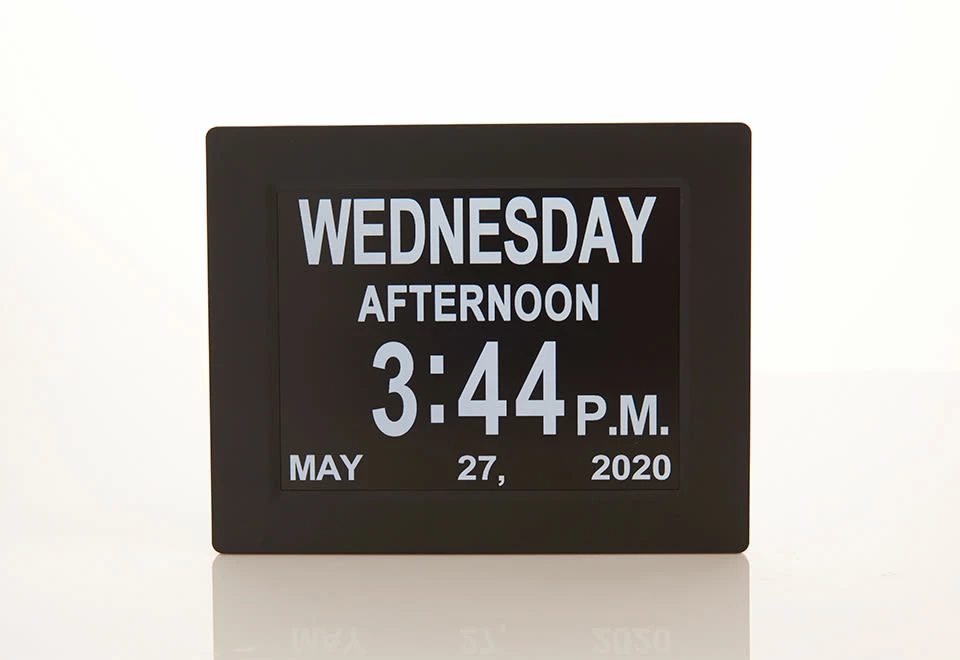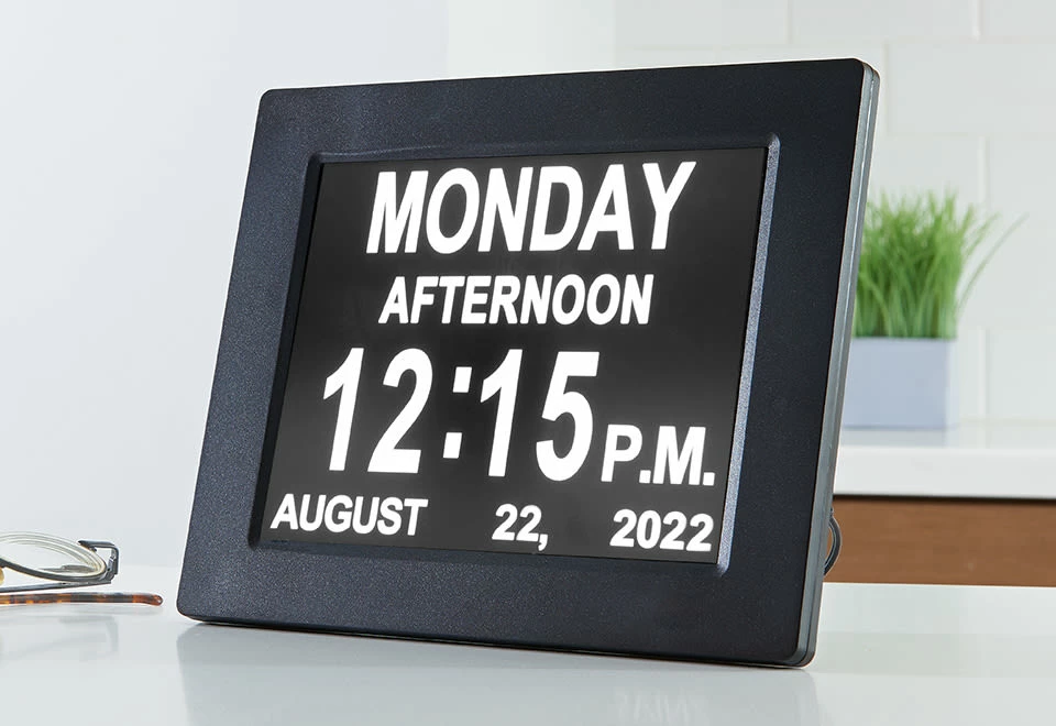 The Easy To Read Digital Clock is perfect for home or office, or any place you need to see the time and date quickly. Its large 8” LCD screen shows the day, time and date in oversized characters. Features 12 different alarms for wakeup and daily activities (medicine, meals, etc.), automatic nighttime dimming, 12- and 24-hr. formats and 8 language options. Hangs on a wall or stands on a tabletop.