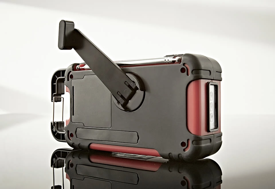 • Can also be charged with the built-in handcrank dynamo generator