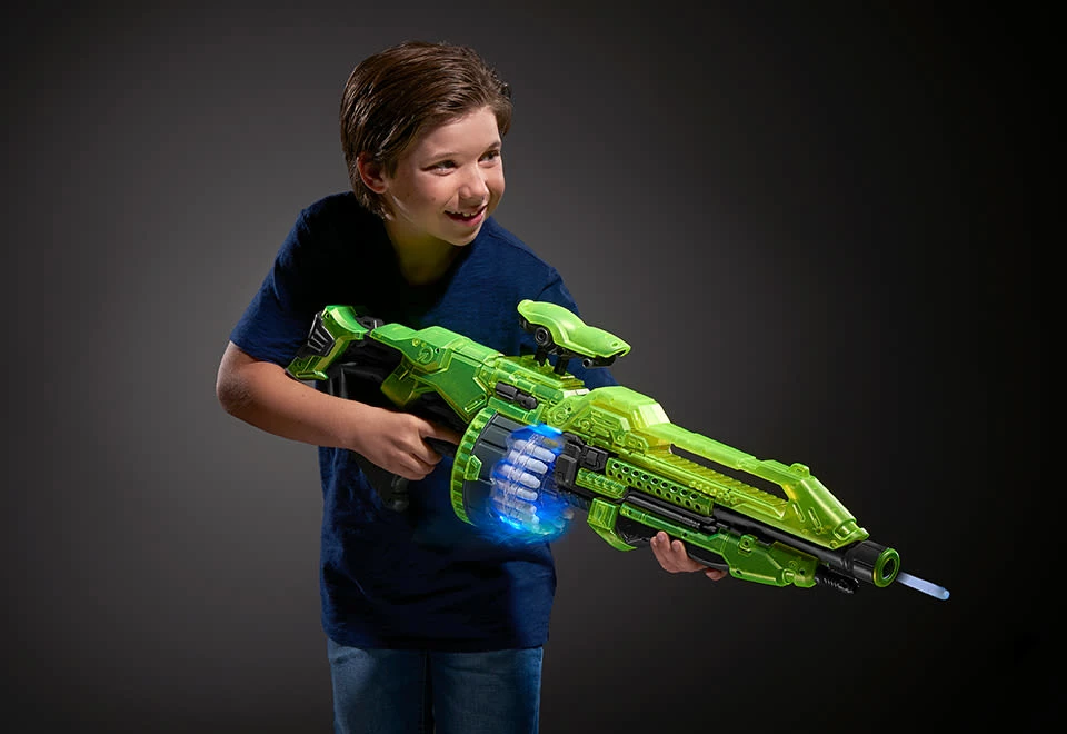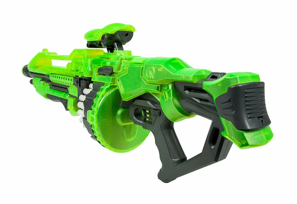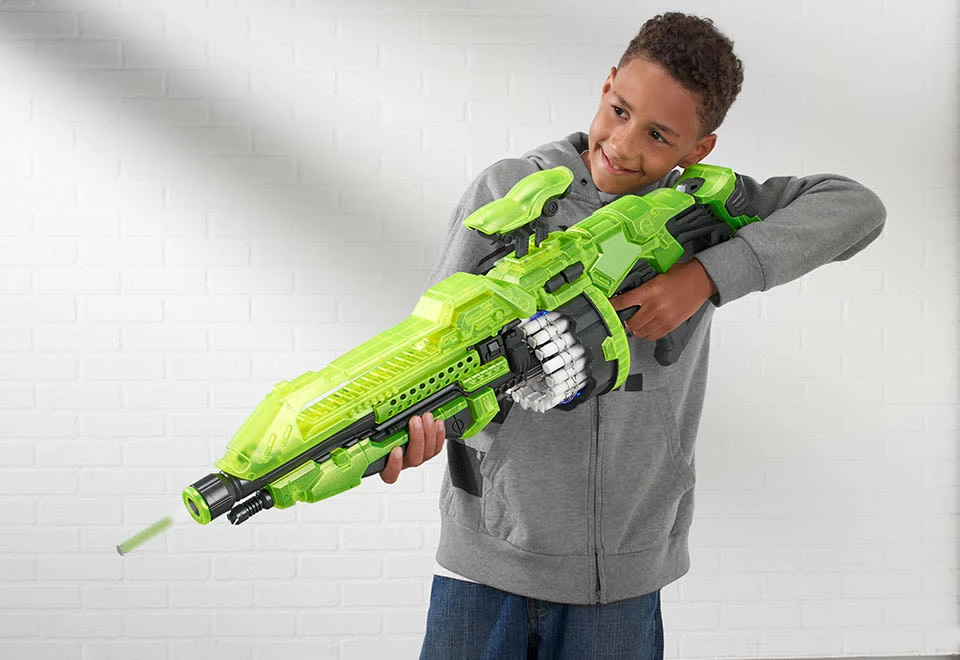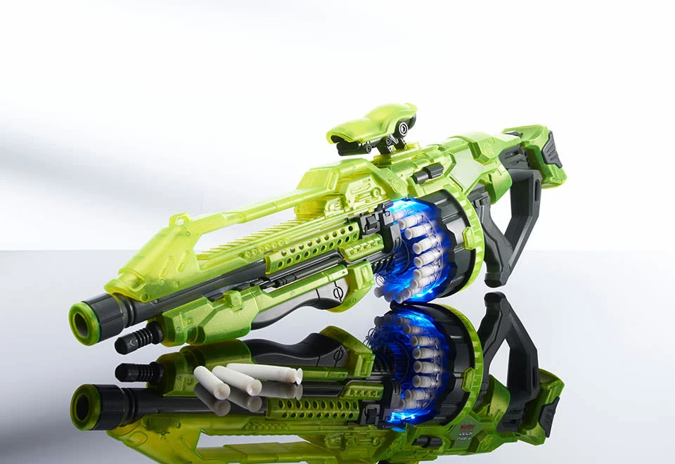 Wage a backyard battle with our Glow-in-the-Dark Dart Blaster! It features a drum-style magazine and a built-in electric fan that shoots darts up to 45 feet!