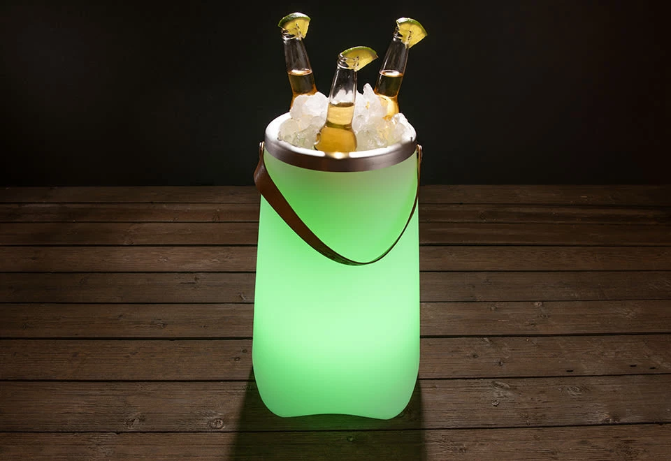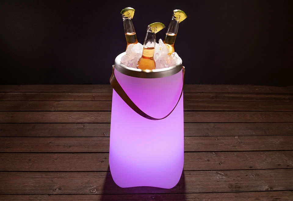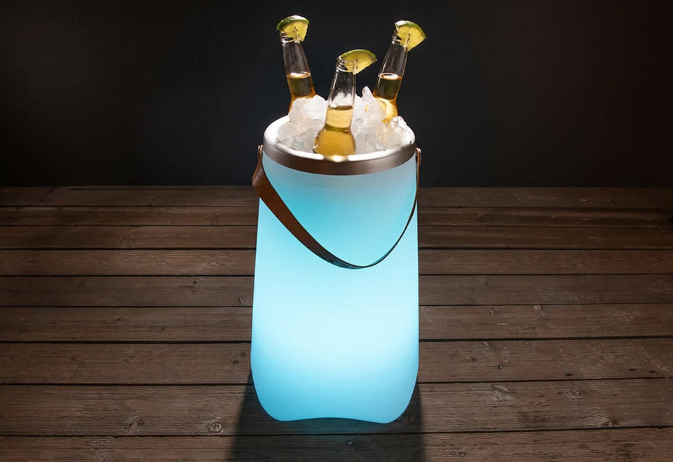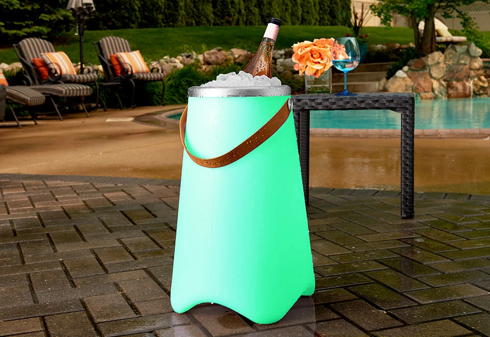 Add a splash of color to your party with the Lighted Wine Bucket and Speaker! Featuring an 8-key wireless remote and seven different LED color variants, you’re always in complete control of the mood, music and atmosphere. Its water-resistant exterior makes it a perfect poolside companion. Holds one standard wine or liquor bottle. Charger plugs into an AC outlet.