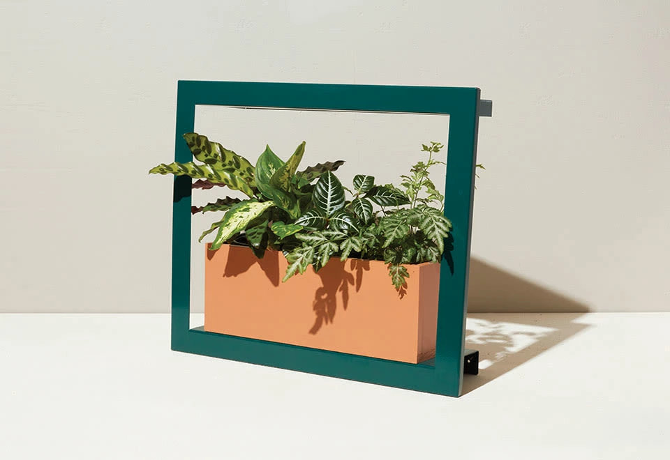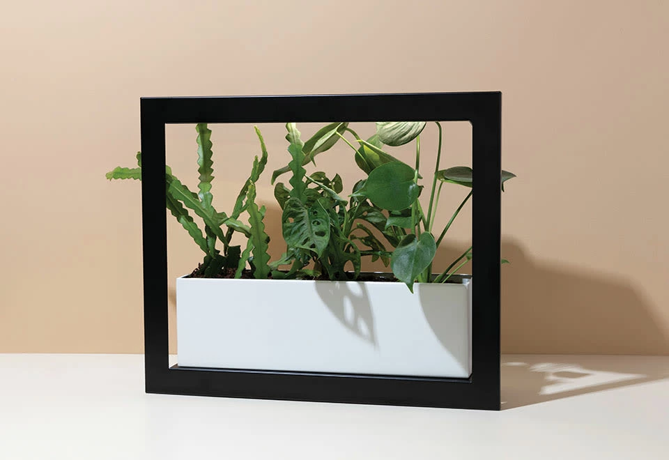 The Plant Growing Frame is the vital solution for creating a lush vertical plantscape in sun-deprived spaces. It beautifully frames and thoughtfully nourishes low-to-bright light loving plants.