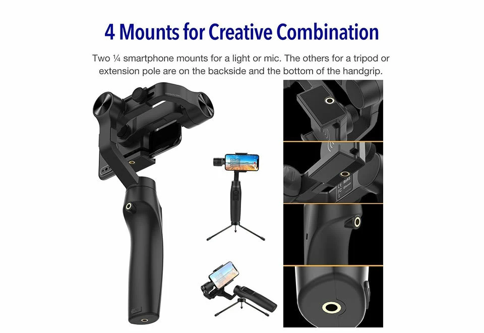 • Features four, ¼ accessory mounts (two mounts for smartphones and two for a tripod or extension pole)