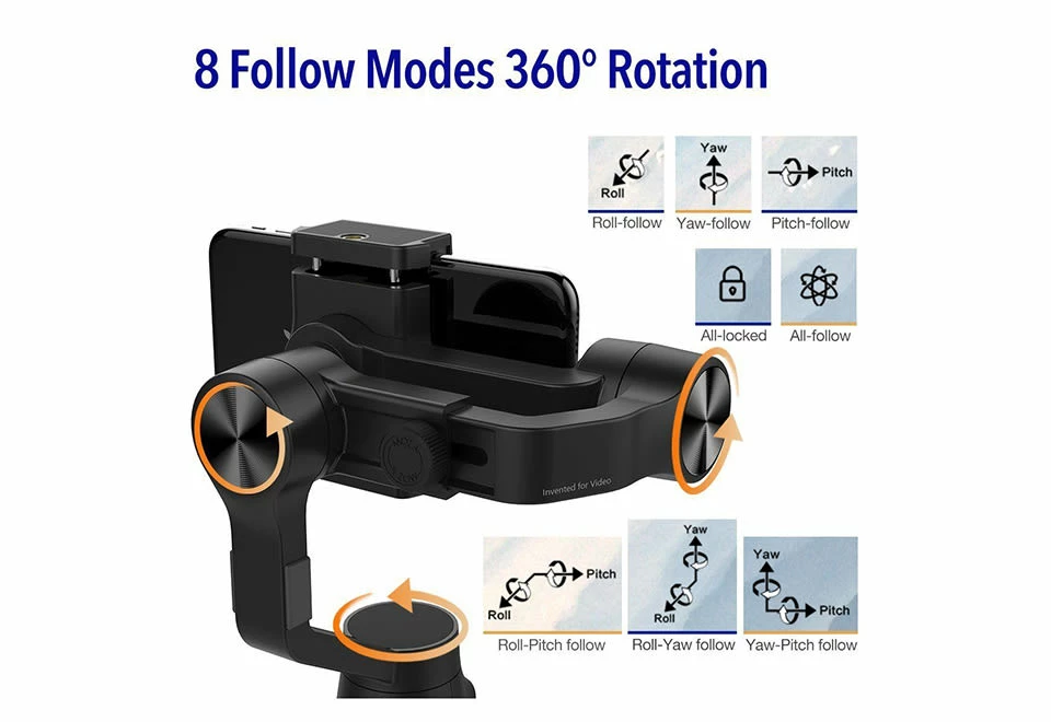 • 8 follow modes: roll-follow, yaw-follow, pitch-follow, all-locked, all-follow, roll-pitch follow, roll-yaw follow and yaw-pitch follow