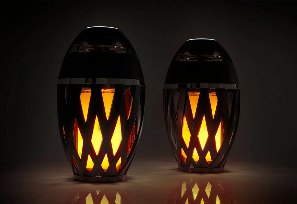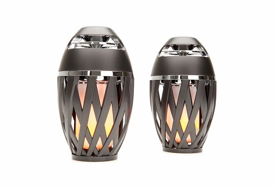 Get the party started with Tiki Torch Outdoor Bluetooth Speakers. They provide robust sound in a compact design, plus flickering ambient light.