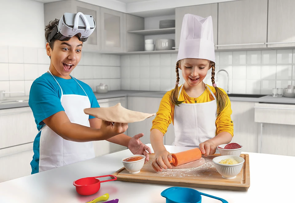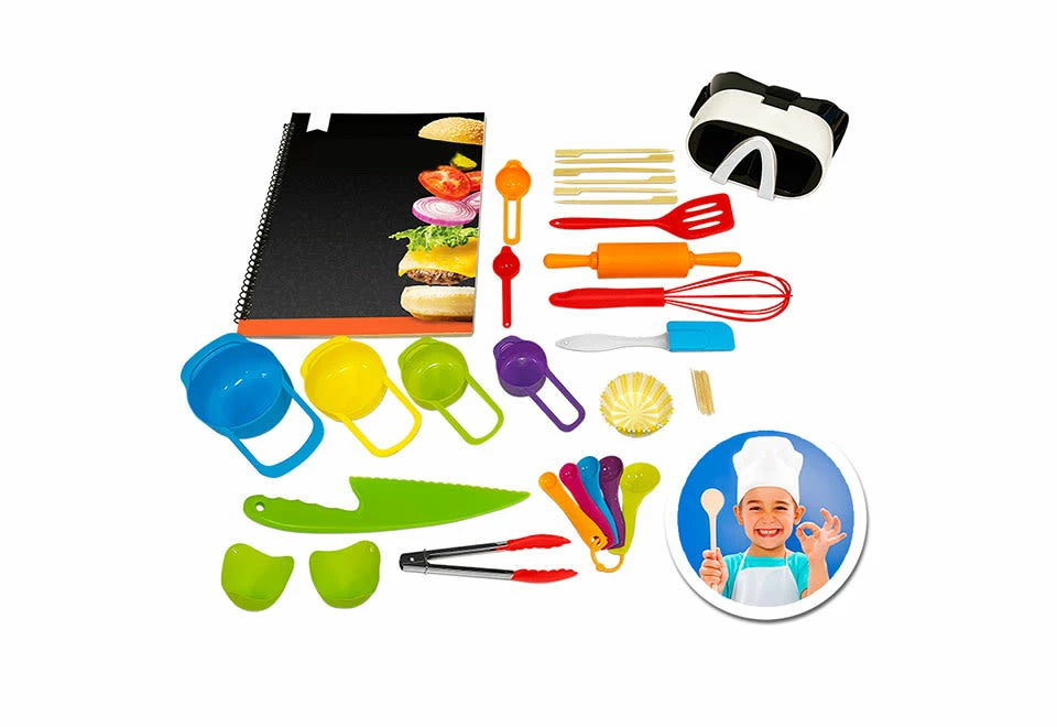 • Kit includes VR goggles, 64-page interactive cookbook, cooking tools, chef’s hat and apron