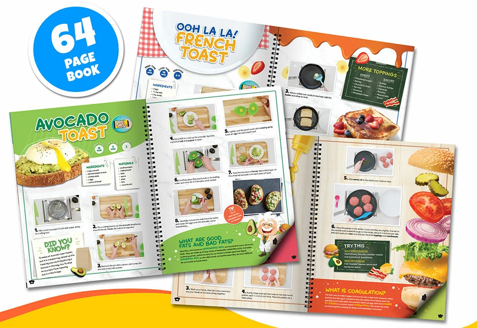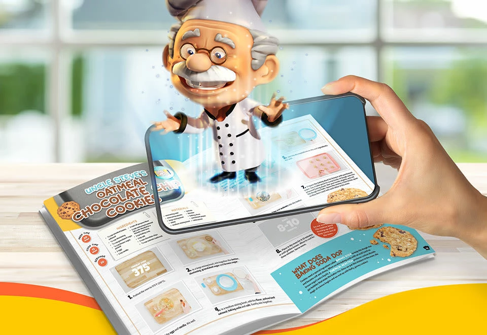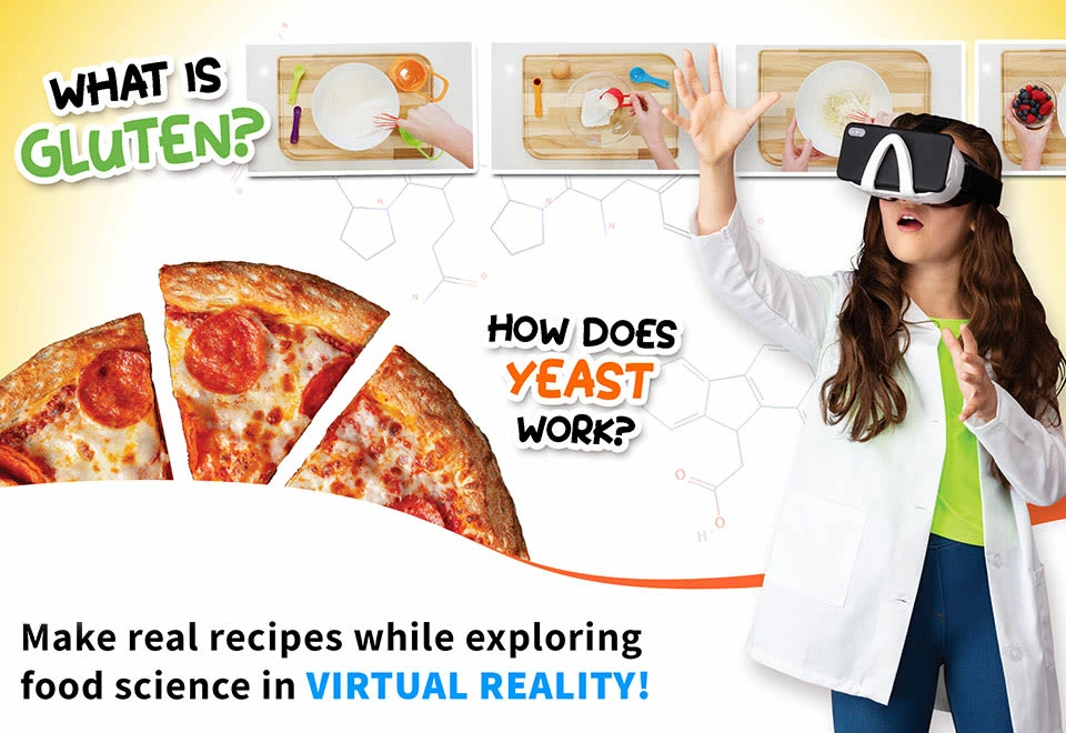 The Virtual Reality Chef Kit is an immersive educational toy experience that teaches kids the art and science of cooking. Download the free app to watch “Professor Maxwell” leap off the page with step-by-step instructions and lessons.